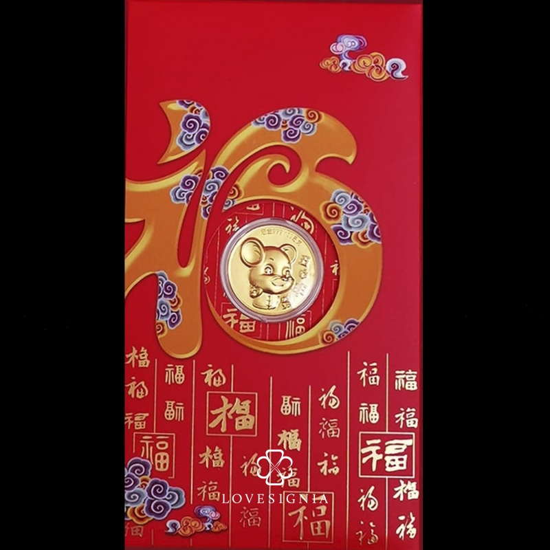 0.1 gram of 999 pure gold coin featuring "Fortune Rat" of the Chinese Zodiac, in an "Ang Bao" packaging.