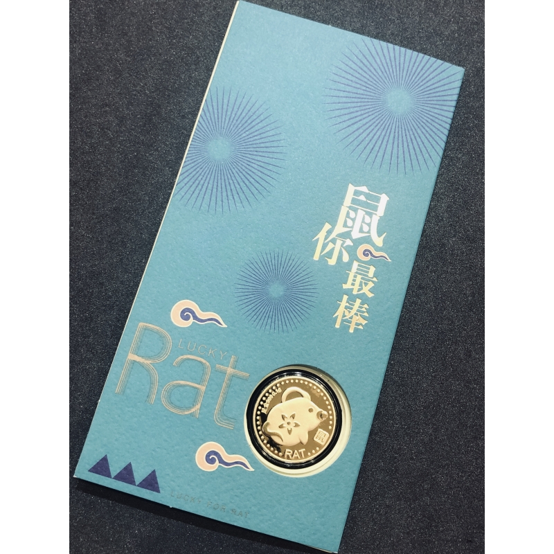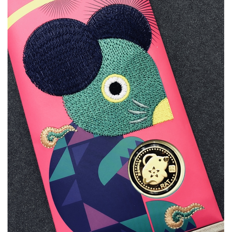 0.1 gram of 999 pure gold coin featuring "Fortune Mouse" of the Chinese Zodiac, in a modern Embroidery Ang Bao packaging.