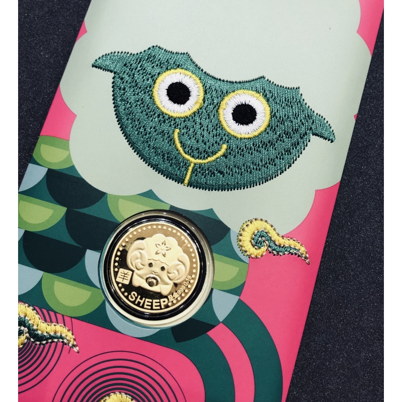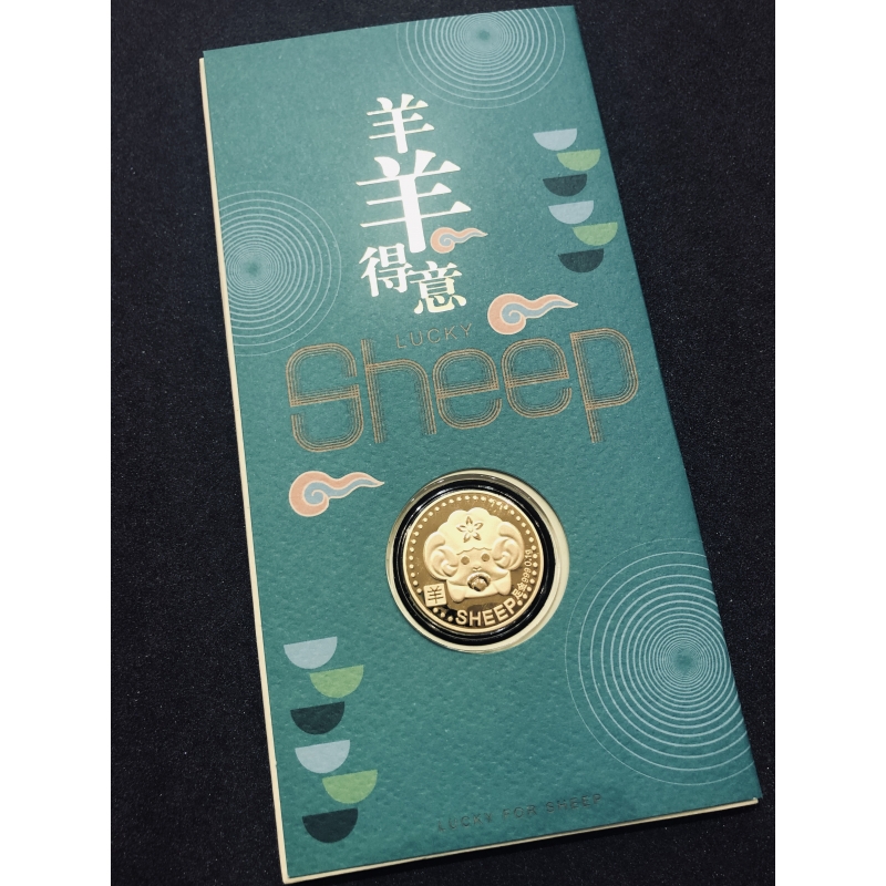 0.1 gram of 999 pure gold coin featuring "Fortune Sheep" of the Chinese Zodiac, in a modern Embroidery Ang Bao packaging.