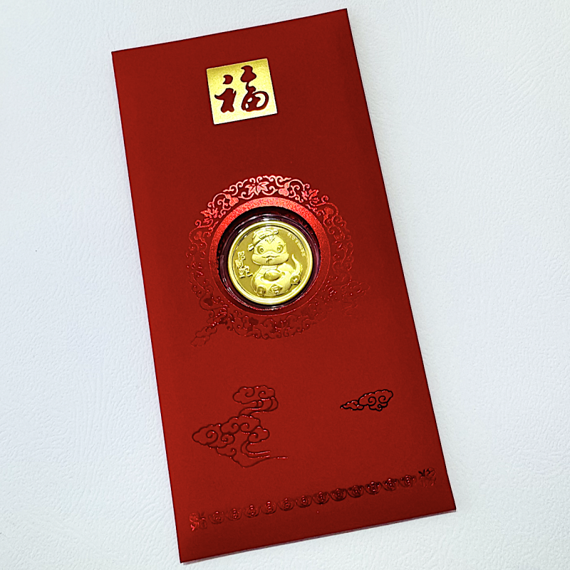 0.1 gram of 999 pure gold coin featuring "招财蛇" of the Chinese Zodiac, encased in acrylic protector and completed with a red envelope packaging.