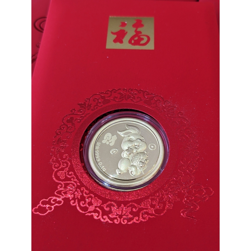 0.1 gram of 999 pure gold coin featuring "财兔" of the Chinese Zodiac, encased in acrylic protector and completed with a red envelope packaging.