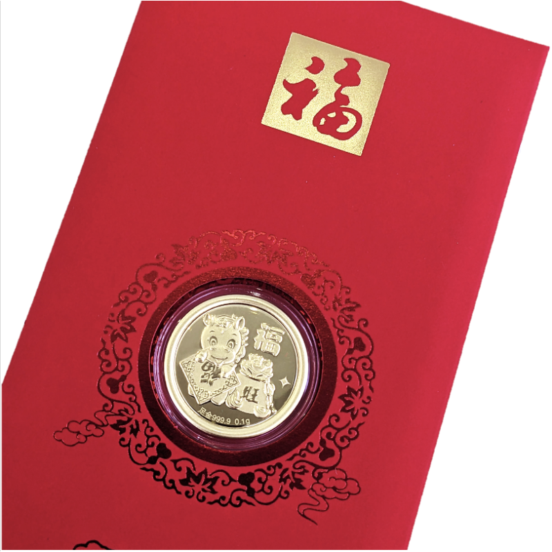 0.1 gram of 999 pure gold coin featuring "福马" of the Chinese Zodiac, encased in acrylic protector and completed with a red envelope packaging.